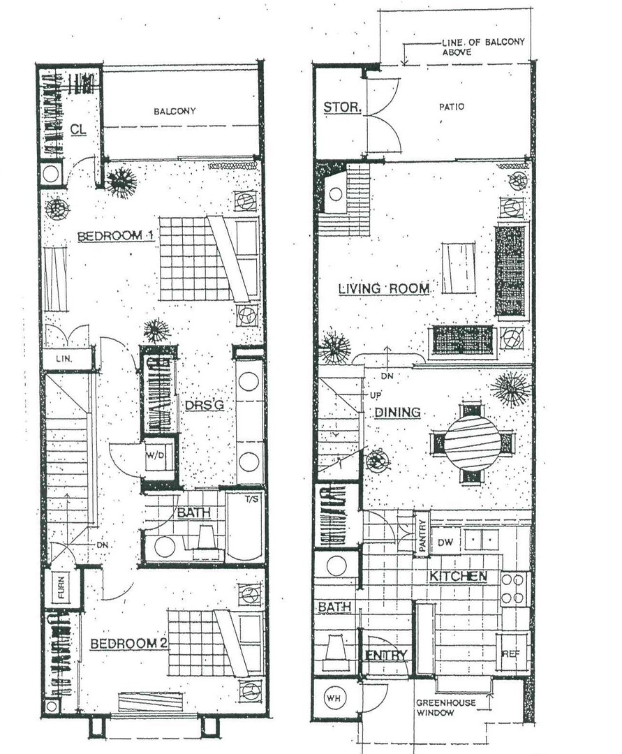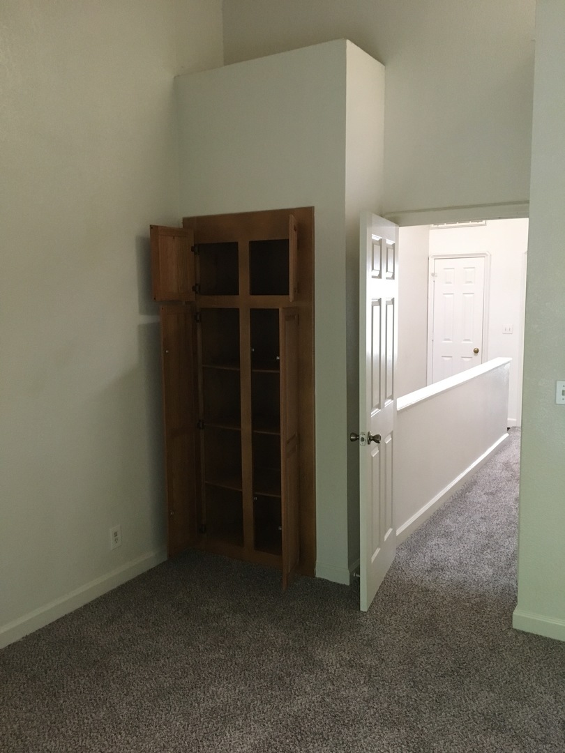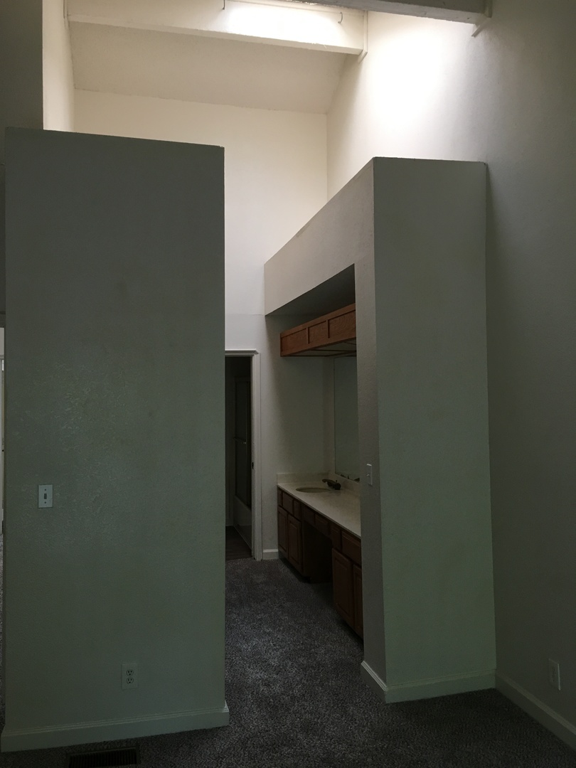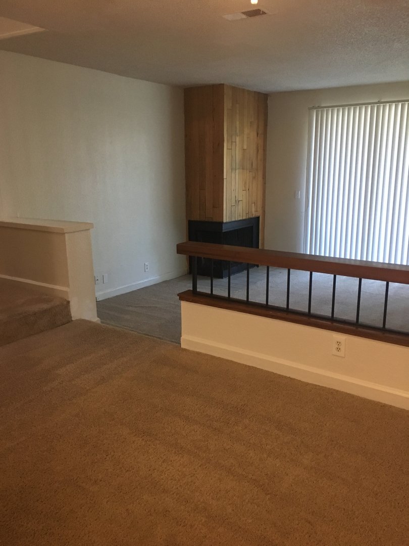 This is our two bedroom town home with a huge open kitchen and a sunken living room with a corner fireplace. There is a large patio with additional storage area. There is a half bath on the ground level for guests. Upstairs is a shared bathroom with the master having it's own private double sinks and two large closets and a private balcony.